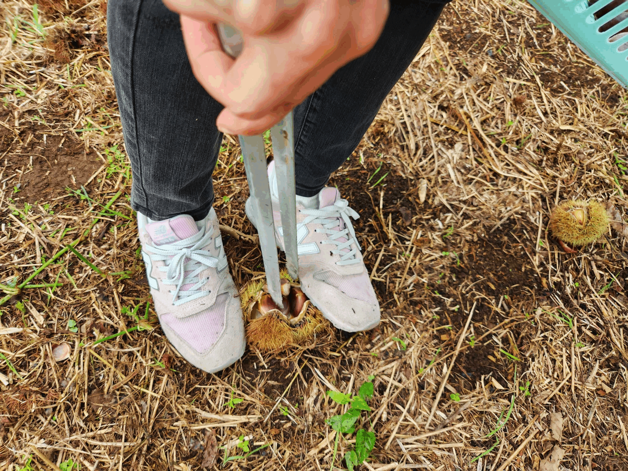 栗拾いは、カゴとトングを持って栗畑へ。木に青い”いがぐり”がたくさんついているので、それを取るのかと思いきや、目指すは落ちているほうの茶色いいがぐりだった。これを両足で挟んで開くと、中から大きなピカピカの栗が出てくる。だから栗の場合は、「栗狩り」とは言わずに「栗拾い」なのだと納得。あちこちにいがぐりが落ちているのでつい夢中になる。大人の私でも、大きくてまん丸な栗を見つけた時は、童心に返って喜んでしまった。